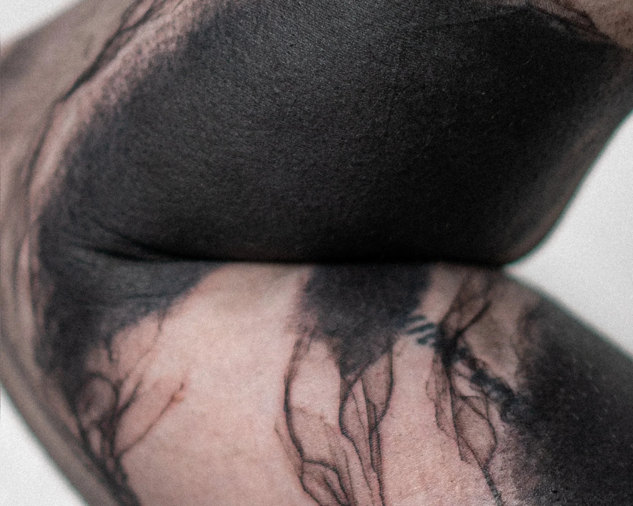 Here we find stains, smears, smudges, and texture. My process has two core aims. The first is finding unique expression through tattooing that is bold and personal. My second aim is to play with techniques to intentionally and expressively show my hand and tools in the work.